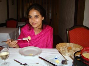 Swiss Fondue peppered with wine is delectable. Really delicious and we had it in the perfect setting of a Swiss Chalet in Cold Interlaken. Top it up with an ice-cream and it is the perfect recipe.