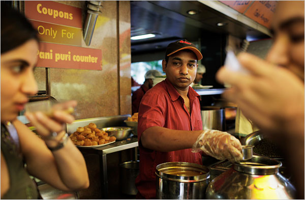 As I sit down to write this piece, I can already see the image of my  local ‘bhaiya’ (the ‘gourmet’ chef who dishes out the delectable delights on the Indian streets)  dishing out the most delectable delights – tangy spicy puchkas, spicy hot vada pavs, bhel puris topped with raw mangoes, neer dosas, usal paav, laasi (sugary buttermilk churned with a dollop of cream and saffron), the famous nimbu  paani ( Lemon juice which has inspired the cola giants to work its flavor)… the never ending list of the sensual and sensational Indian street food goes on!  Working his magic with a single assistant, doing brisk business because everybody’s in a hurry – gossiping, sharing his views of just about everything that’s happened on the global level – yes, at times, he does talk about the stock market too…and piling plates of tangy, spicy, hot, piping food – which makes you forget about everything – when you take the first bite …because from there on starts your journey into a world where taste meets nirvana! A bite into the ‘vada pav’ (The Indian version of a burger) – the burst of the yummy flavor of the chutneys – sweet and tangy, red chillie powder, a dash of garlic, a hint of mint, a dollop of coriander and fried green chillies –   – the combination of it on any given day makes you forget all about your calories and more if you ask me! Makes you forget about the ‘home cooked food’ that awaits you…makes you forget about your mom’s words of wisdom – “Don’t eat street food – the hygiene level would land you in trouble!” But, blame it on the flavor of the masalas and the marriage of the bun or  ‘paav’ and the fried vada (fried potato balls flavored with green chillie, coriander and garlic ) with the chutneys and a plate turns into two – with the order – one for now and one for the road! That’s the lure of the street food.